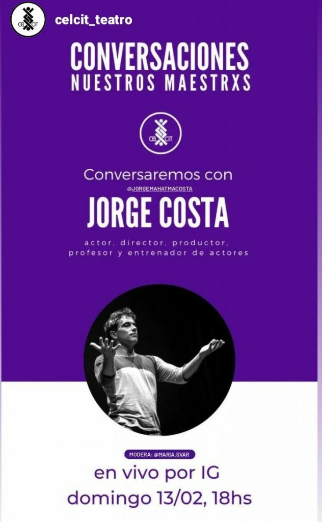 EL DOMINGO 13 DE FEBRERO ESTAREMOS EN VIVO DE INSTAGRAM DENTRO DE LAS EMISIONES DEL CELCIT (Centro Latinoamericano de Creación e Investigación Teatral) CONVERSACIONES CON NUESTROS MAESTROS sobre el HUMOR Y EL CUERPO, Y EL LENGUAJE PROPUESTO EN EL PROXIMO SEMINARIO EN ESA INSTITUCIÓN POR JORGE COSTA.