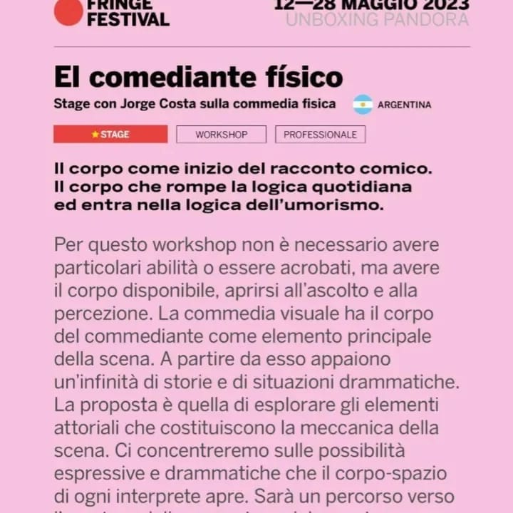 Esta Gira Europea consistirá en una semana de funciones corridas en dicho festival internacional y el dictado de un seminario a cargo de Jorge Costa sobre Comedia Física.
