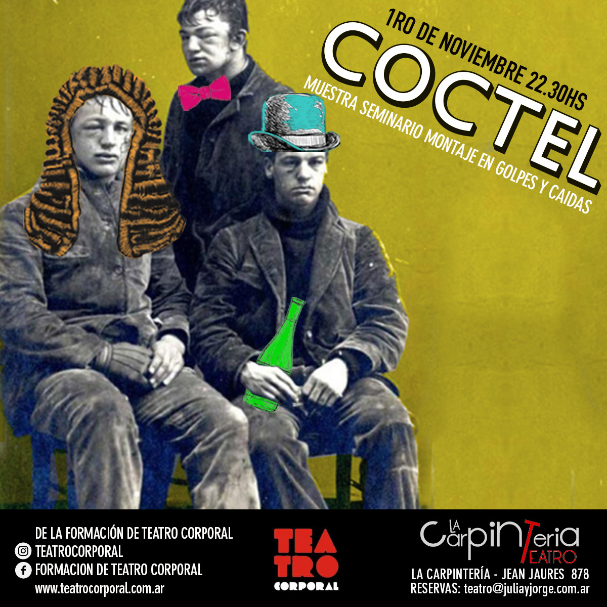 COCTEL28 octubre, 2019 en Novedades Se viene la MUESTRA del SEMINARIO MONTAJE GOLPES Y CAIDAS perteneciente a la Formación de Teatro Corporal 2019: «COCTEL» Viernes 1 ro de Noviembre 22.30 hs en La Carpinteria, Jean Jaures 878 (Abasto) A la Gorra reservas: teatro@juliayjorge.com.ar